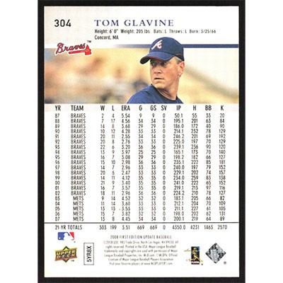 This is a 2008 Upper Deck First Edition Tom Glavine baseball card. The card is #304 and pictures show condition.