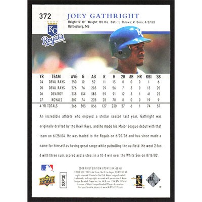 This is a 2008 Upper Deck First Edition Joey Gathright baseball card. The card is #372 and pictures show condition.