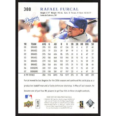 This is a 2008 Upper Deck First Edition Rafael Furcal baseball card. The card is #388 and pictures show condition.