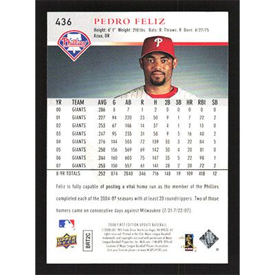 This is a 2008 Upper Deck First Edition Pedro Feliz baseball card. The card is #436 and pictures show condition.