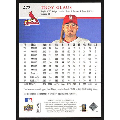 This is a 2008 Upper Deck First Edition Troy Glaus baseball card. The card is #473 and pictures show condition.