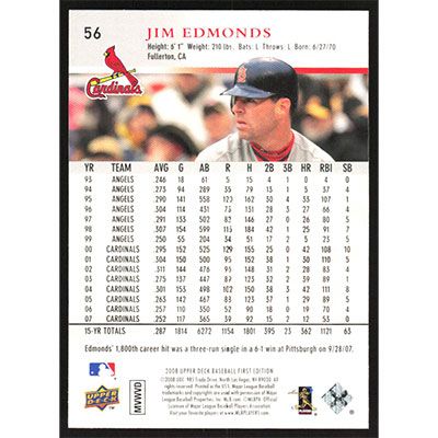 This is a 2008 Upper Deck First Edition Jim Edmonds baseball card. The card is #56 and pictures show condition.