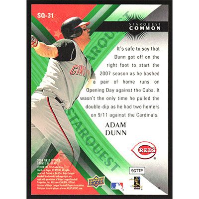 This is a 2008 Upper Deck First Edition StarQuest Adam Dunn baseball card. The card is #SQ-31 and pictures show condition.