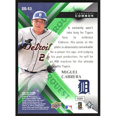 This is a 2008 Upper Deck First Edition StarQuest Miguel Cabrera baseball card. The card is #SQ-53 and pictures show condition.