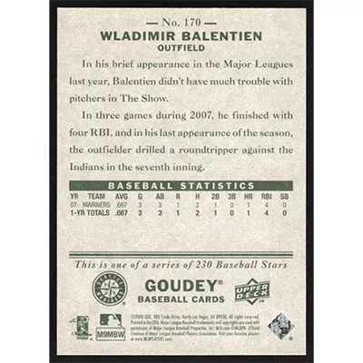 This is a 2008 Upper Deck Goudey Wladimir Balentien baseball card. The card is #170 and pictures show condition. Team(s): Seattle Mariners Rookie Card (RC)