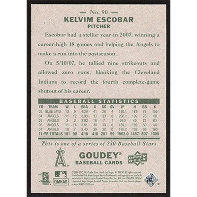 This is a 2008 Upper Deck Goudey Kelvim Escobar baseball card. The card is #90 and pictures show condition.