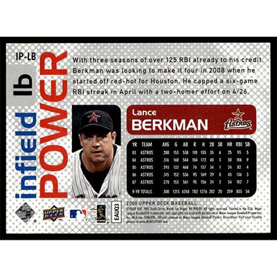 This is a 2008 Upper Deck Infield Power Lance Berkman baseball card. The card is #IP-LB and pictures show condition.