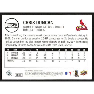 This is a 2008 Upper Deck O-Pee-Chee Chris Duncan baseball card. The card is #OPC-CD and pictures show condition.