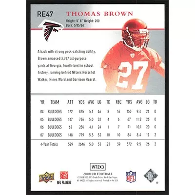 This is a 2008 Upper Deck Rookie Exclusives Thomas Brown football card. The card is #RE47 and pictures show condition.