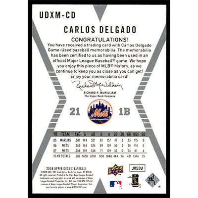 This is a 2008 Upper Deck X Memorabilia Carlos Delgado Jersey baseball card. The card is #UDXM-CD and pictures show condition.