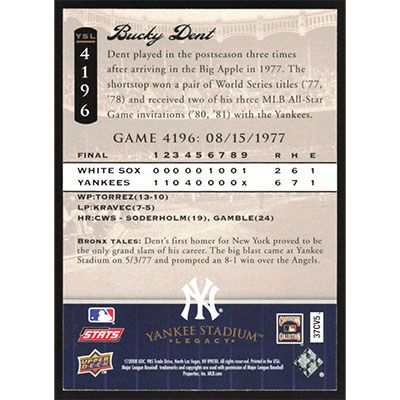 This is a 2008 Upper Deck Yankee Stadium Legacy Bucky Dent baseball card. The card is #4196 and pictures show condition.