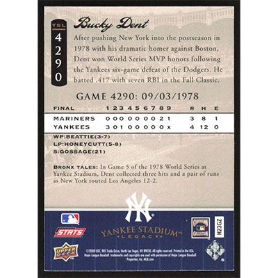 This is a 2008 Upper Deck Yankee Stadium Legacy Bucky Dent baseball card. The card is #4290 and pictures show condition.
