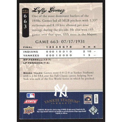 This is a 2008 Upper Deck Yankee Stadium Legacy Collection Lefty Gomez baseball card. The card is #663 and pictures show condition. Team(s): New York Yankees