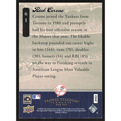 This is a 2008 Upper Deck Yankee Stadium Legacy Collection Box Set Rick Cerone baseball card. The card is #61 and pictures show condition. Team(s): New York Yankees