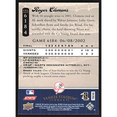 This is a 2008 Upper Deck Yankee Stadium Legacy Collections Roger Clemens baseball card. The card is #6184 and pictures show condition. Team(s): New York Yankees