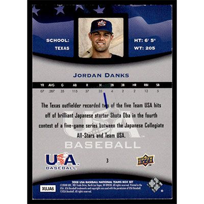 This is a 2008 USA Baseball Jordan Danks autographed baseball card. This card has been signed, in black, by Jordan Danks, and is guaranteed authentic by Ballcardz.com. The card is #3 and pictures show condition.