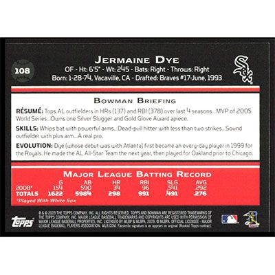 This is a 2009 Bowman Jermaine Dye baseball card. The card is #108 and pictures show condition.