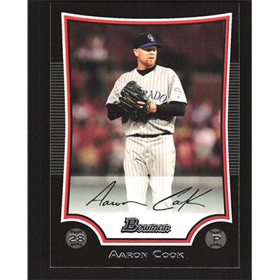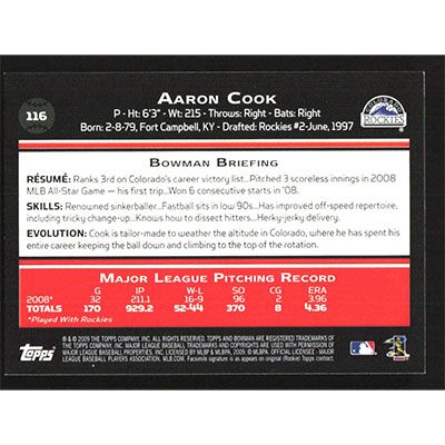This is a 2009 Bowman Aaron Cook baseball card. The card is #116 and pictures show condition.