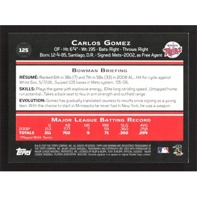 This is a 2009 Bowman Carlos Gomez baseball card. The card is #125 and pictures show condition.