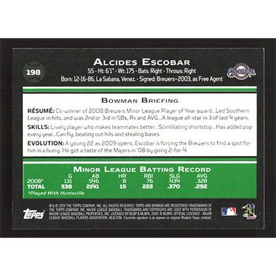 This is a 2009 Bowman Alcides Escobar baseball card. The card is #198 and pictures show condition.