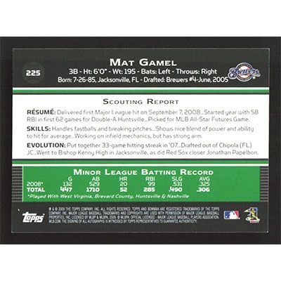This is a 2009 Bowman Mat Gamel autographed baseball card. This card has been signed, in blue, by Mat Gamel, and is certified authentic by Topps. The card is #225 and pictures show condition.