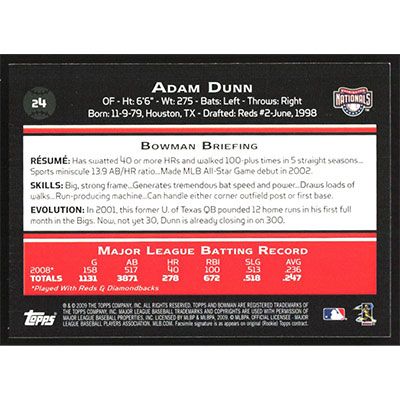 This is a 2009 Bowman Adam Dunn baseball card. The card is #24 and pictures show condition.
