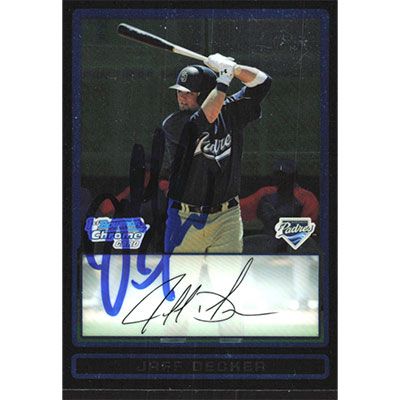 This is a 2009 Bowman Chrome Draft Prospects Jaff Decker autographed baseball card. This card has been signed, in blue, by Jaff Decker, and is guaranteed authentic by Ballcardz.com. The card is #BDPP32 and pictures show condition.