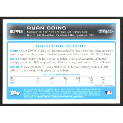 This is a 2009 Bowman Chrome Draft Prospects Ryan Goins baseball card. The card is #BDPP61 and pictures show condition.