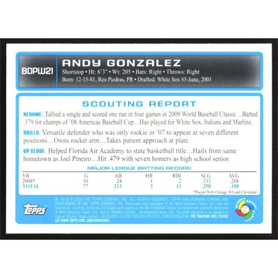 This is a 2009 Bowman Chrome Draft WBC Prospects Andy Gonzalez baseball card. The card is #BDPW21 and pictures show condition.