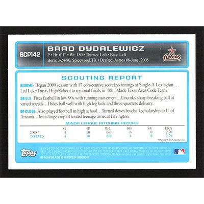 This is a 2009 Bowman Chrome Prospects Brad Dydalewicz baseball card. The card is #BCP142 and pictures show condition.