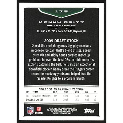 This is a 2009 Bowman Draft Kenny Britt football card. The card is #175 and pictures show condition. Team(s): Rutgers Scarlet Knights Rookie Card (RC)