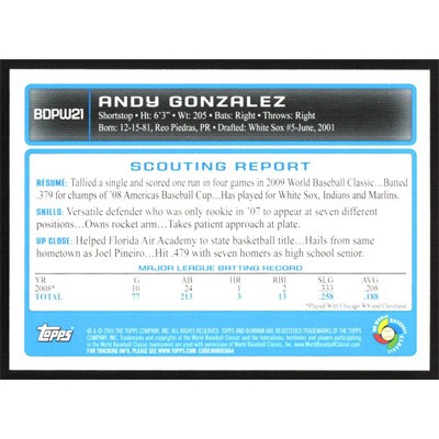 This is a 2009 Bowman Draft WBC Prospects Andy Gonzalez baseball card. The card is #BDPW21 and pictures show condition.