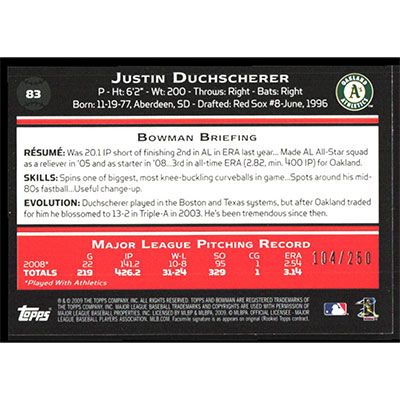 This is a 2009 Bowman Orange Justin Duchscherer baseball card. The card is #83 and pictures show condition. This card is limited; #'d 104/250. Team(s): Oakland Athletics