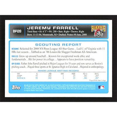 This is a 2009 Bowman Prospects Jeremy Farrell baseball card. The card is #BP28 and pictures show condition.