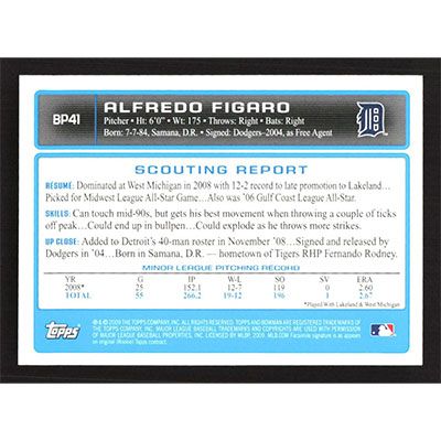 This is a 2009 Bowman Prospects Alfredo Figaro baseball card. The card is #BP41 and pictures show condition.