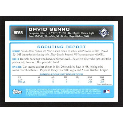This is a 2009 Bowman Prospects David Genao baseball card. The card is #BP63 and pictures show condition.