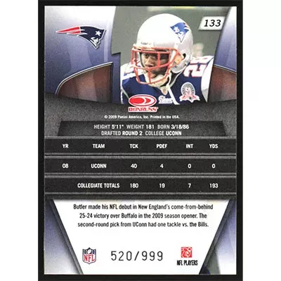 This is a 2009 Donruss Gridiron Gear Darius Butler football card. The card is #133 and pictures show condition. This card is limited; #'d 520/999. Team(s): New England Patriots Rookie Card (RC)