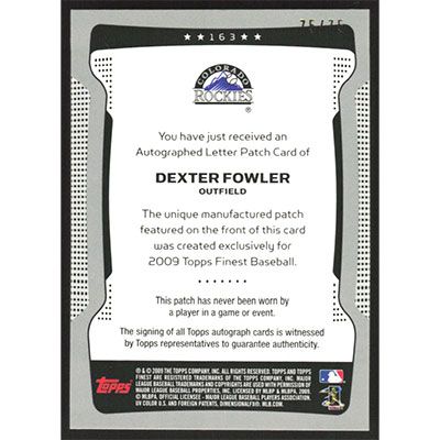 This is a 2009 Finest Refractors Dexter Fowler Jersey Nameplate autographed baseball card. This card has a commemorative jersey letter patch, that has been signed, in silver, by Dexter Fowler, and is certified authentic by Topps. The card is #163 and pictures show condition. This card is limited; #'d 75/75.