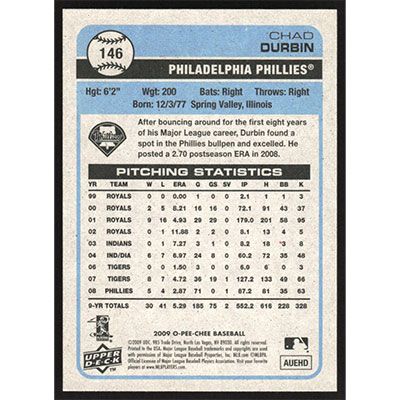 This is a 2009 O-Pee-Chee Chad Durbin baseball card. The card is #146 and pictures show condition.