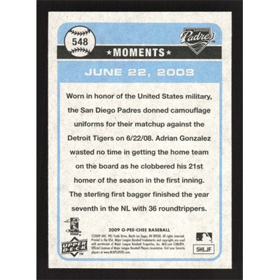 This is a 2009 O-Pee-Chee Adrian Gonzalez Moments baseball card. The card is #548 and pictures show condition.