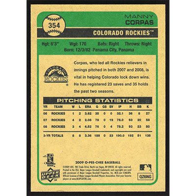 This is a 2009 O-Pee-Chee Black Manny Corpas baseball card. The card is #354 and pictures show condition.