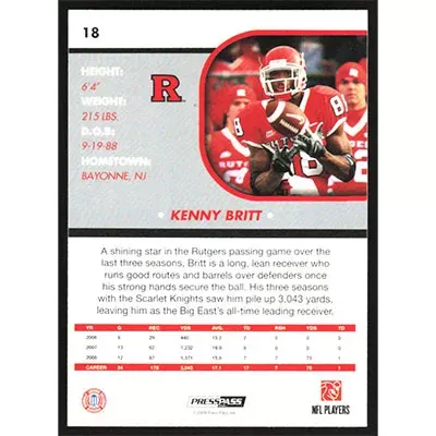 This is a 2009 Press Pass SE Kenny Britt football card. The card is #18 and pictures show condition. Team(s): Rutgers Scarlet Knights Rookie Card (RC)