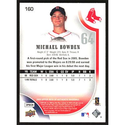 This is a 2009 SP Authentic Michael Bowden baseball card. The card is #160 and pictures show condition.
