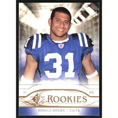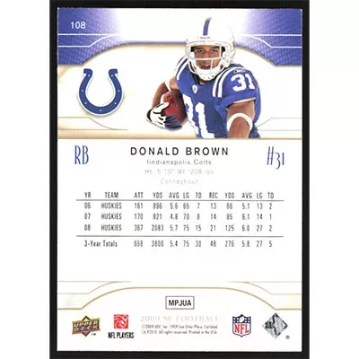 This is a 2009 SP Authentic Retail Donald Brown football card. The card is #108 and pictures show condition. Team(s): Indianapolis Colts Rookie Card (RC)