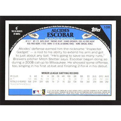 This is a 2009 Topps Alcides Escobar baseball card. The card is #108 and pictures show condition.