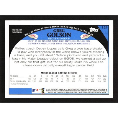 This is a 2009 Topps Greg Golson baseball card. The card is #121 and pictures show condition.