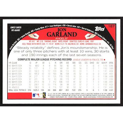 This is a 2009 Topps Jon Garland baseball card. The card is #187 and pictures show condition.
