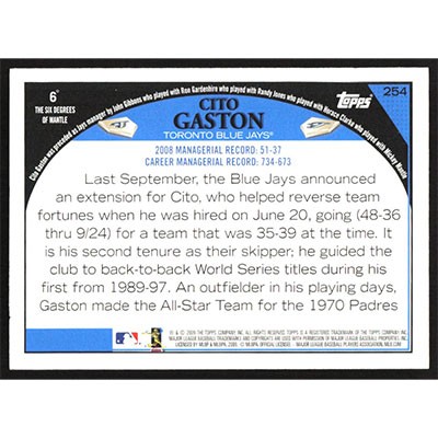This is a 2009 Topps Cito Gaston autographed baseball card. This card has been signed, in blue, by Cito Gaston, and is guaranteed authentic by Ballcardz.com. The card is #254 and pictures show condition.