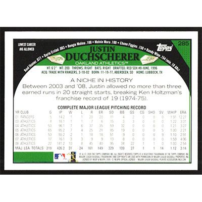 This is a 2009 Topps Justin Duchscherer baseball card. The card is #285 and pictures show condition.