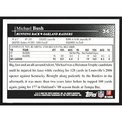 This is a 2009 Topps Michael Bush football card. The card is #34 and pictures show condition.
